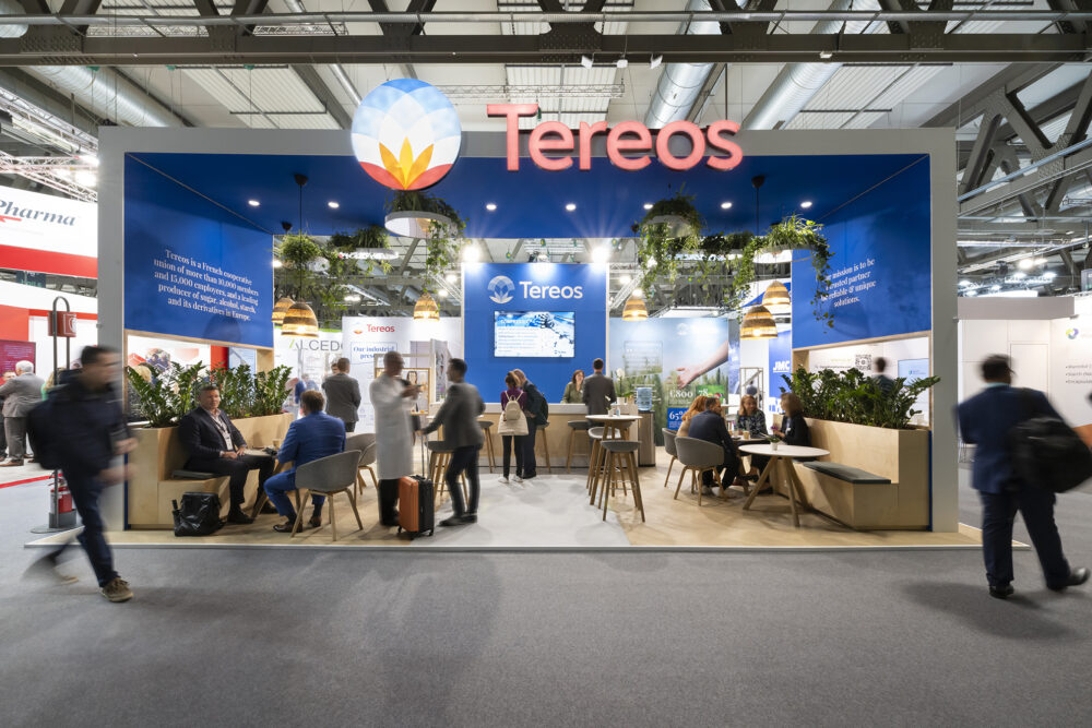 At CPHI Milan, Tereos created a sustainable stand featuring recycled wood seating, a reusable structure, and low-consumption LED lighting—strengthening their brand image while reducing their carbon footprint.