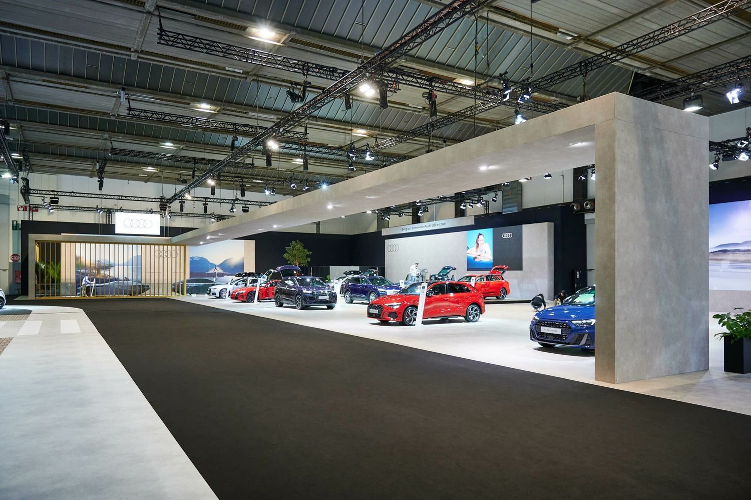 - Audi at Brussels Auto Show → Monumental arch structure creating depth and grandeur.