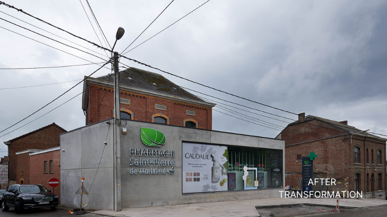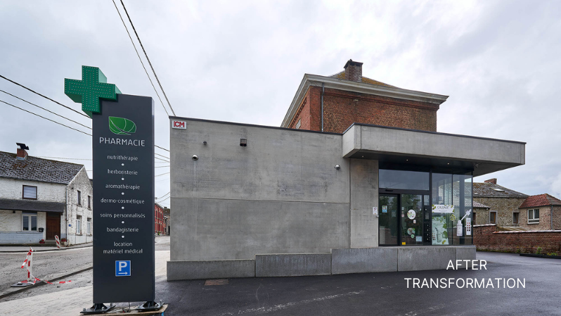 C’est grâce à la construction d’une annexe très moderne, implantée sur l’ancien parking, que l’officine a pu être agrandie. Le parking a quant à lui été déplacé sur le terrain situé à côté de l’officine.